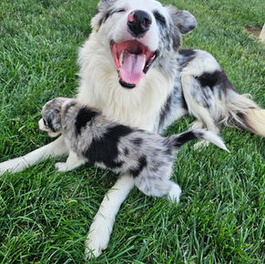 Little Boy Blue, aka "Blue" is an AKC and ABCA registered Border Collie. He is a beautiful blue merle and carries one copy of the M allele of the PMEL merle gene (size 269). This means he will likely pass on the merle gene to 50% of his babies. Blue also has one blue eye and one brown eye and the sweetest soul! We found Blue shortly after losing our Brisby and he has been the perfect addition to our family and the girls adore him! He is the smartest boy and he loves to please. He is so obedient and learns commands within a few minutes, but more importantly he is such a loving pup and cannot get enough attention. His favorite thing to do is cuddle and give the best kisses. He sired 3 litters in 2025 and they are the sweetest little souls! We had blue, red and lilac merles, gorgeous red and whites with Border Collie markings, solid blacks and reds and all are over the top affectionate!